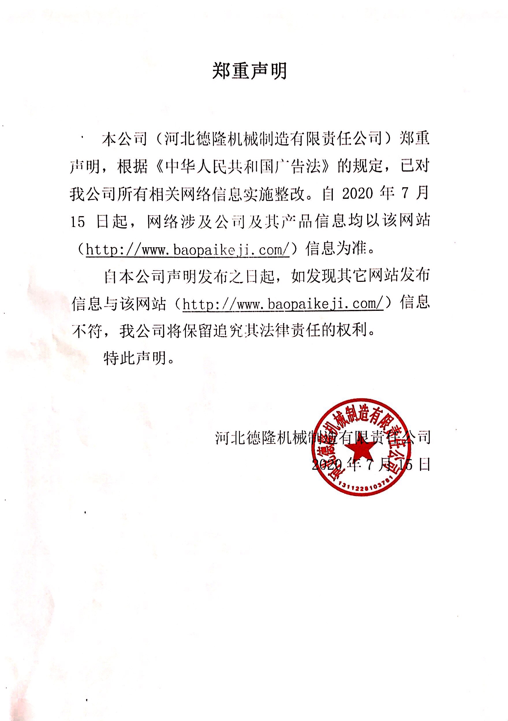 河北德隆機(jī)械制造有限責(zé)任公司對(duì)相關(guān)網(wǎng)絡(luò)信息實(shí)施整改的鄭重聲明